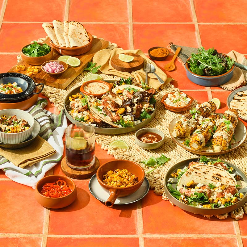 To serve, top warm tortillas with mixed lettuce, followed by sliced steak and charred corn. Drizzle with smoky tangy sauce and top with crumbled feta and fresh coriander leaves. Serve with additional Smoky Chipotle Salsa and Chipotle Hot Sauce.