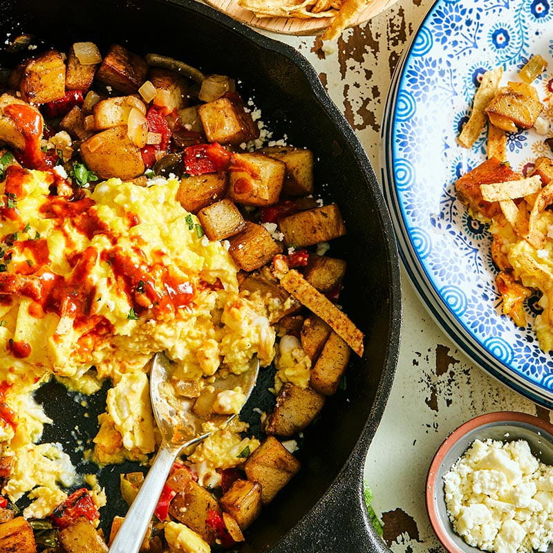 Spoon eggs into center of skillet. Remove skillet from heat. Sprinkle tortilla strips over eggs and top with crumbled Cotija and cilantro. Drizzle with Cholula Hot Sauce or Cremosa, if desired.