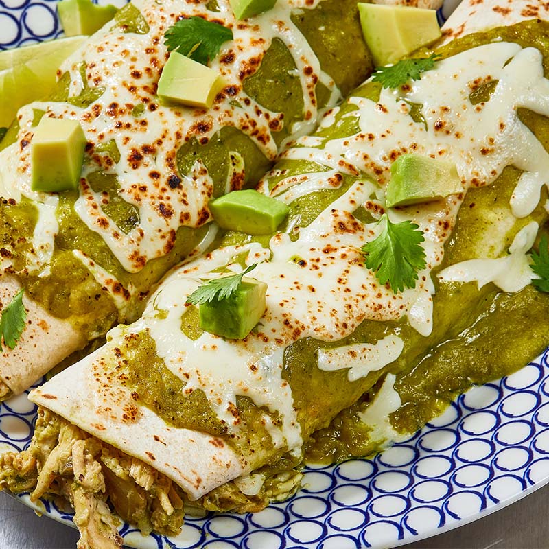 - 5 Bake 30 minutes. Remove foil. Bake 10 - 15 minutes longer, or until enchiladas are bubbling and cheese is golden. Let stand 10 minutes. Serve with remaining chopped avocado.