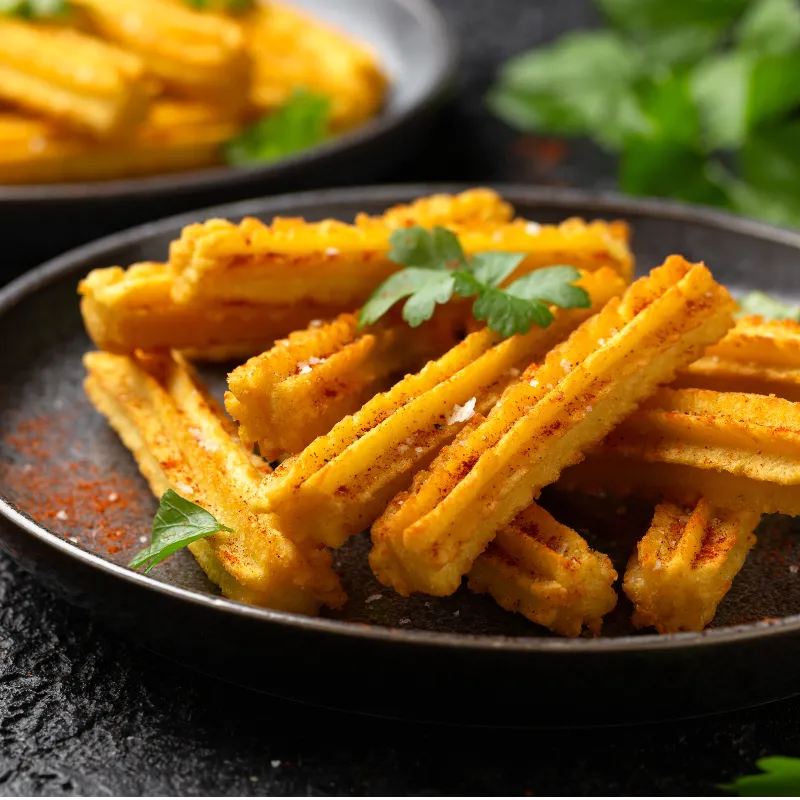 - 8 En una cacerola grande, calienta el aceite. Llena una manga pastelera con la masa, elige una boquilla en forma de estrella. Forma churros directamente en el aceite caliente.
